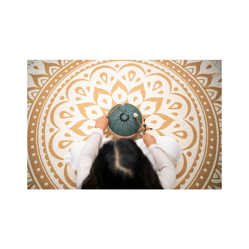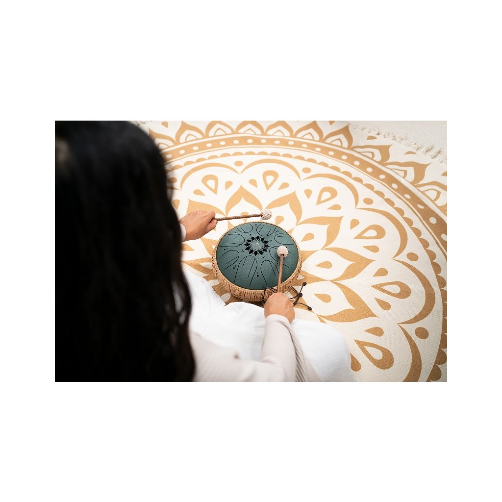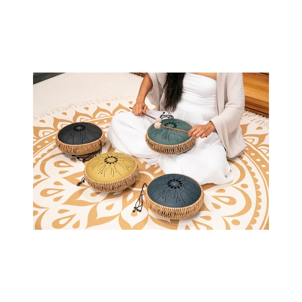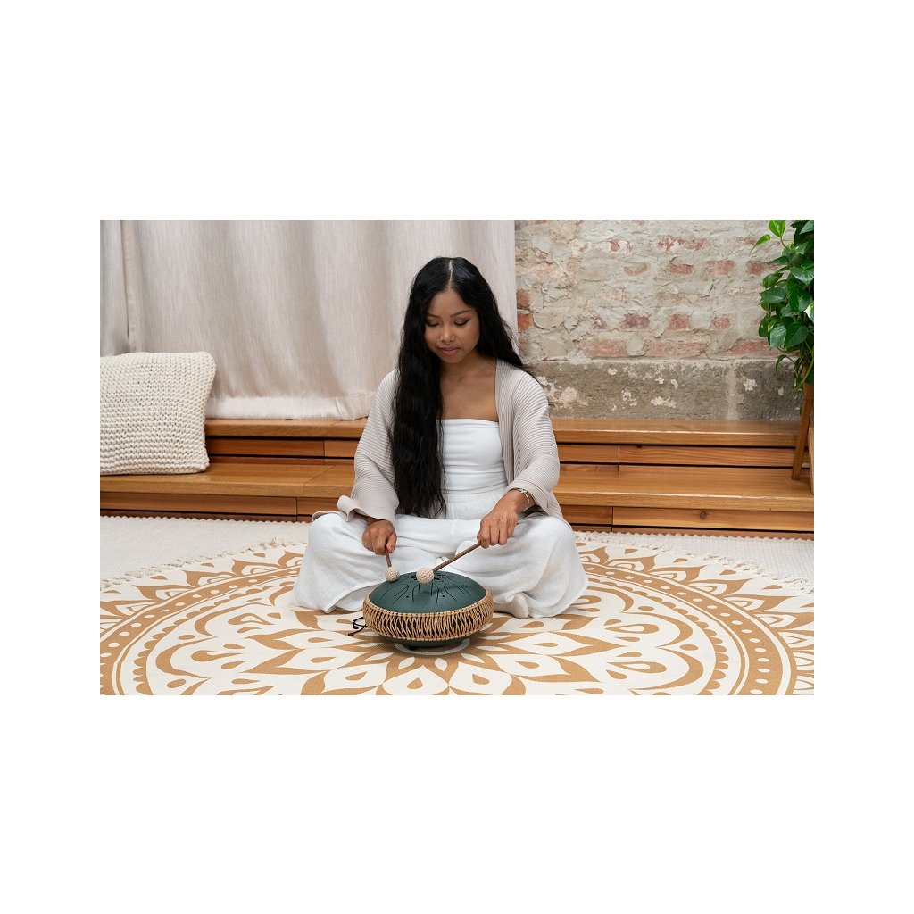 Ak chcete začať hrať, jednoducho položte nástroj na rovný povrch alebo pohodlne do lona. Bubon je dodávaný s dvoma drevenými paličkami s mäkkou gumenou hlavou a krásnym puzdrom na zips s rukoväťou.