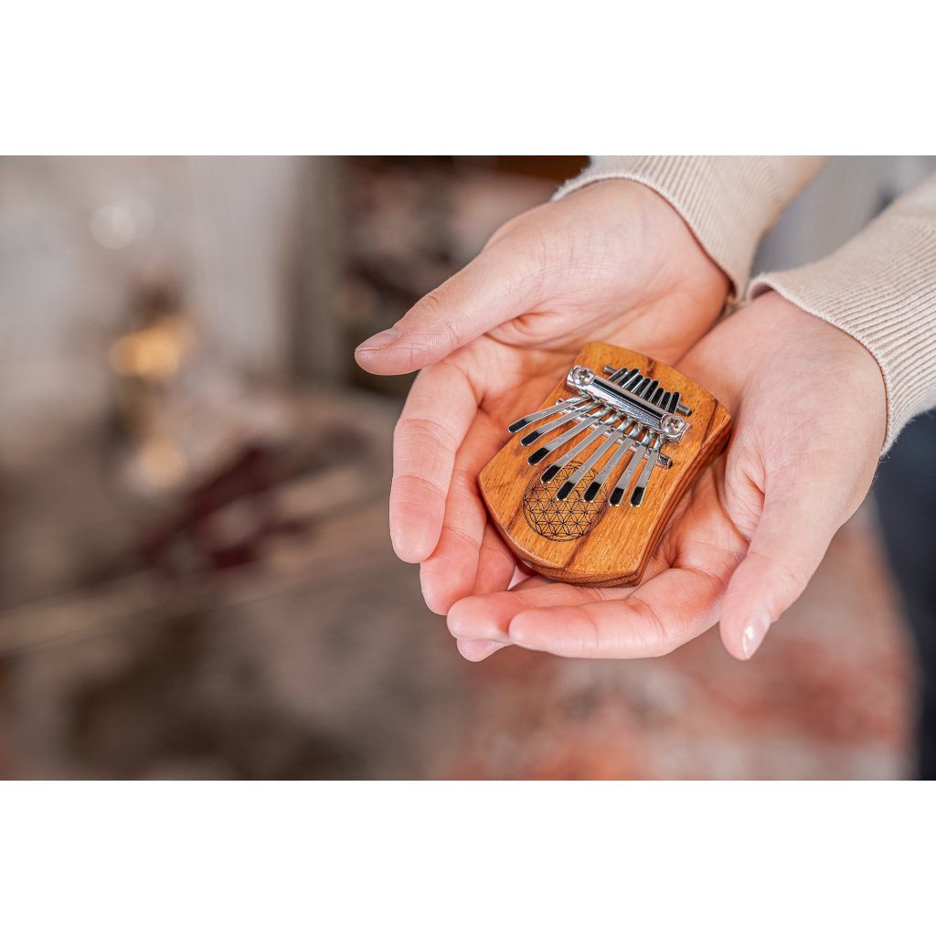 Mini Kalimba je vyrobená z krásneho masívneho červeného zebrového dreva v matnom prevedení s nádherným vyrezávaním „Kvet života“, alebo "Strom života".