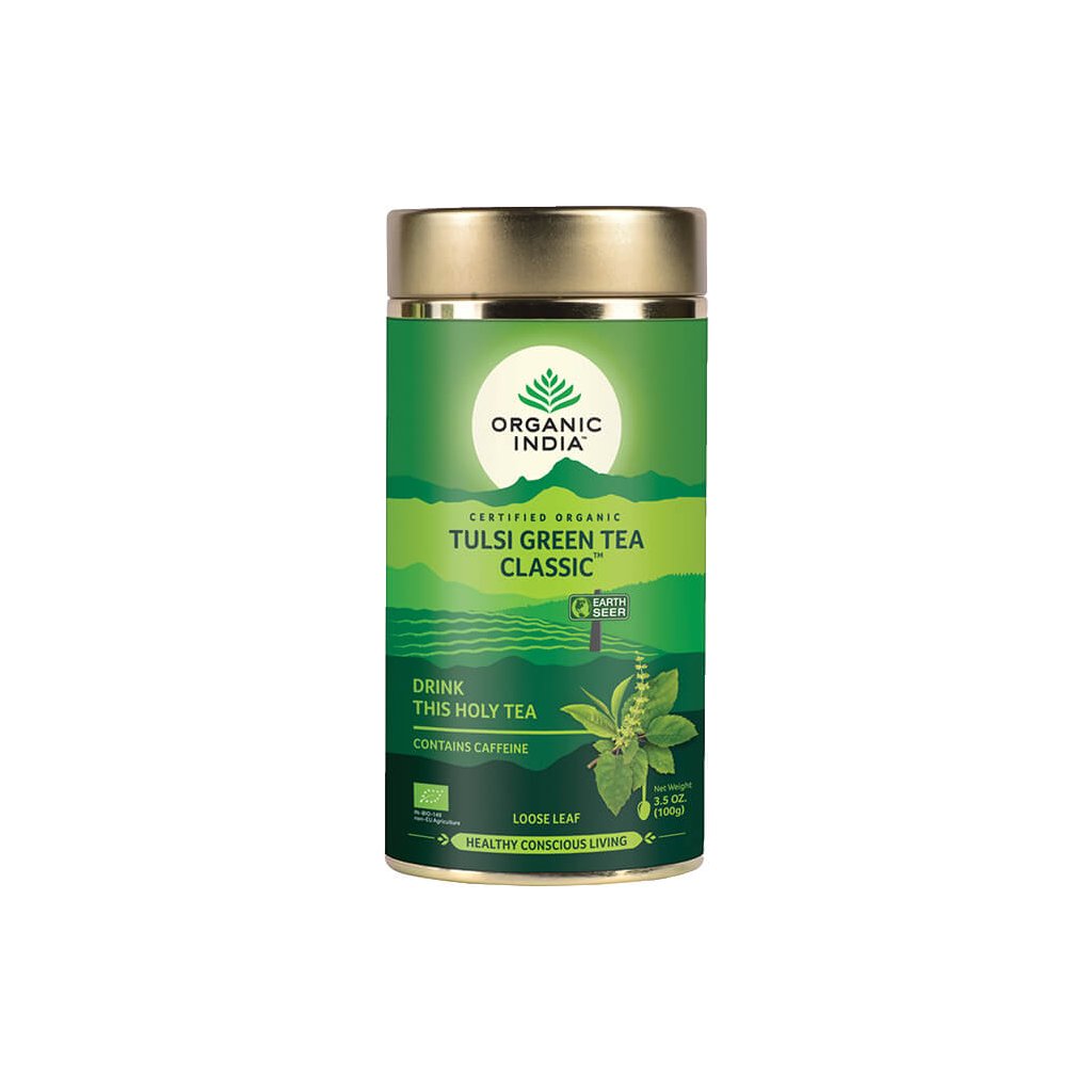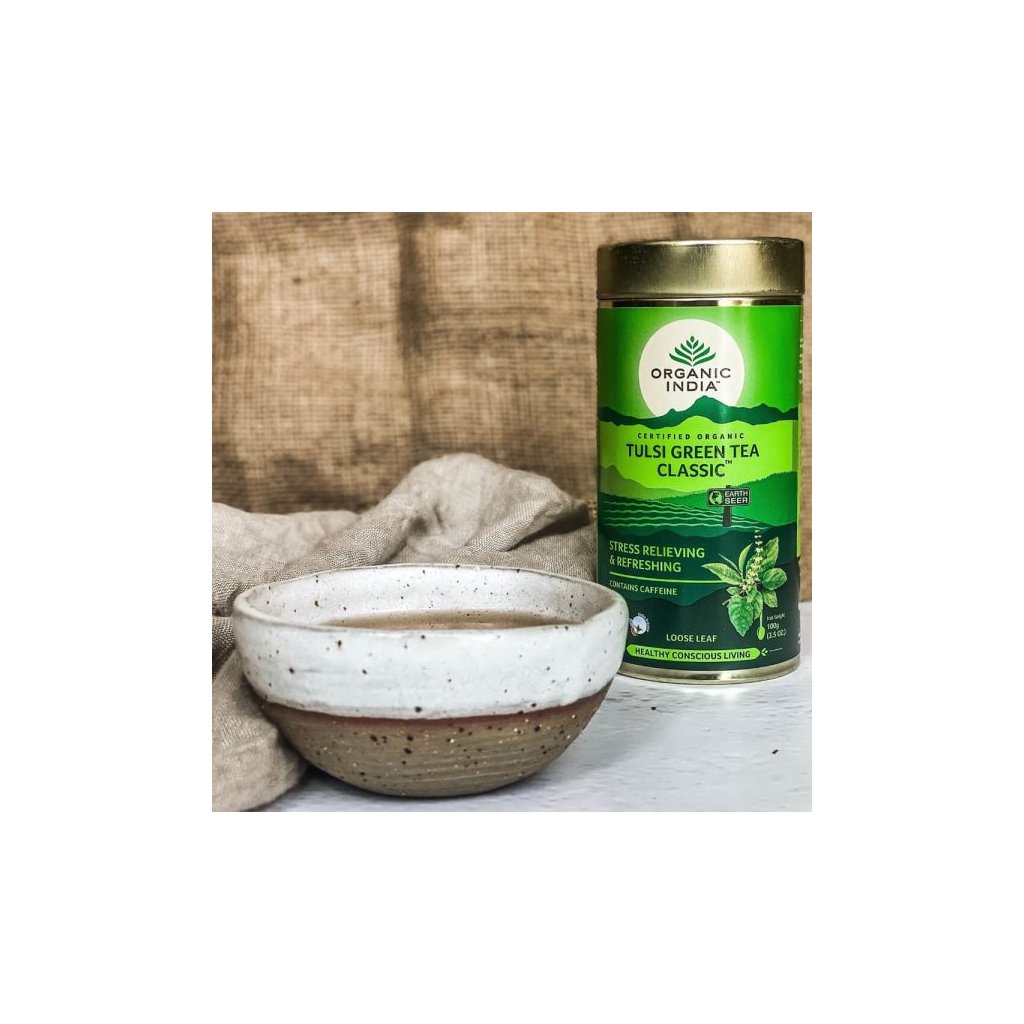 Organic India Tulsi so zeleným čajom BIO je sypaný čaj kombinujúci tulsi (bazalku posvätnú) a zelený čaj. Je vhodný na denné pitie, keď je preferovaná jemná stimulácia a vyvážená chuť. Zmes obsahuje mierny obsah kofeínu zo zeleného čaju.