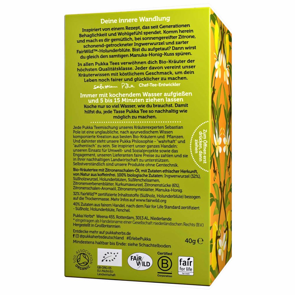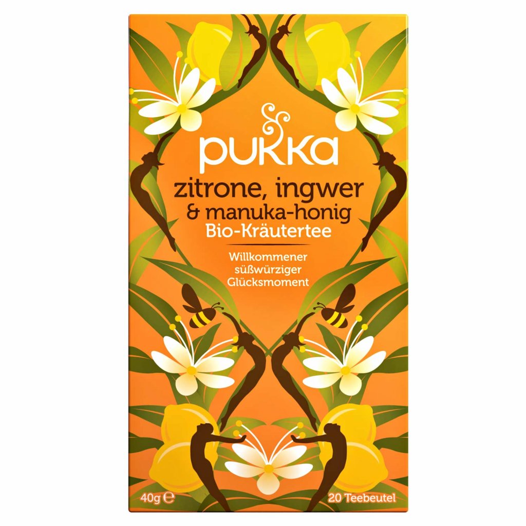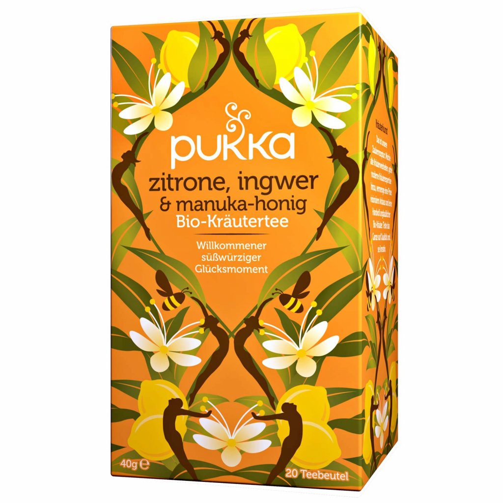 Čaj Pukka Lemon, Ginger & Manuka-Honey je hlboko upokojujúca, tradičná zmes pikantného citrónu a koreneného zázvoru so sladkými, výživnými tónmi manuka medu.