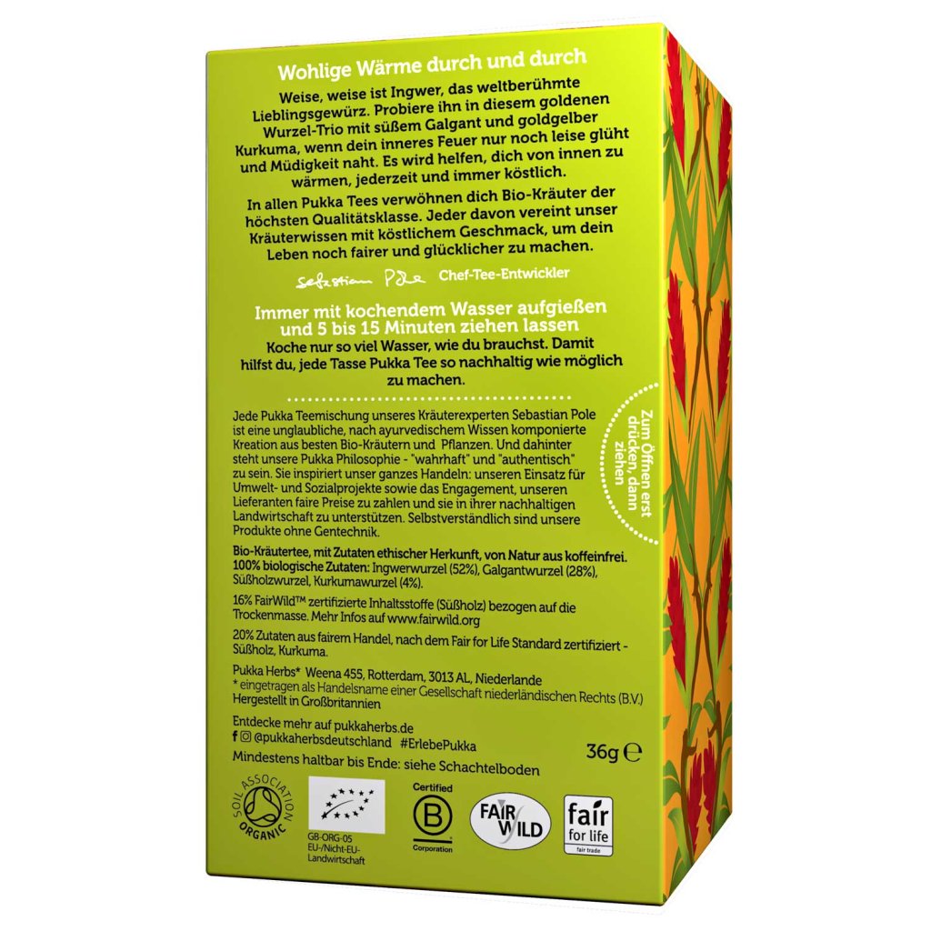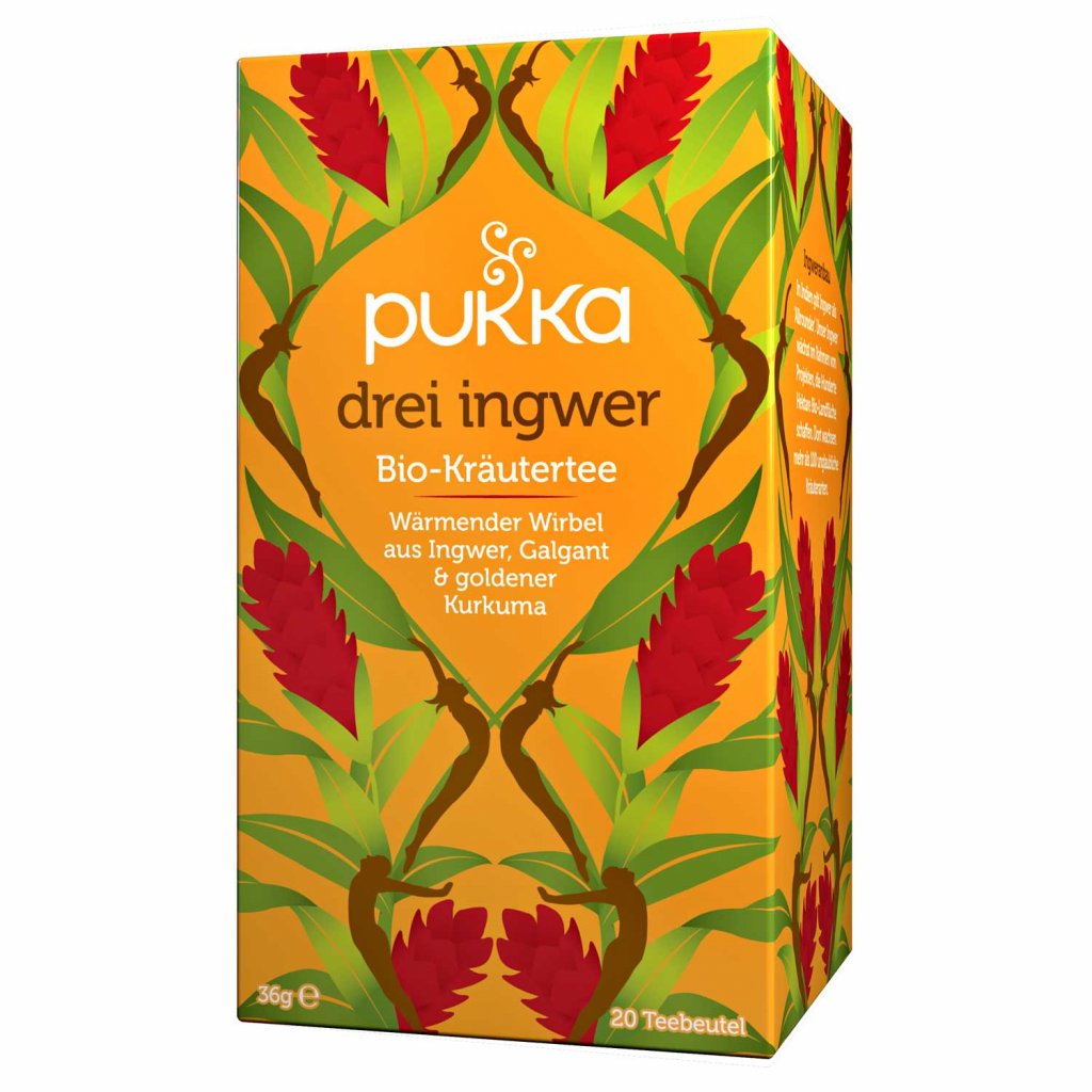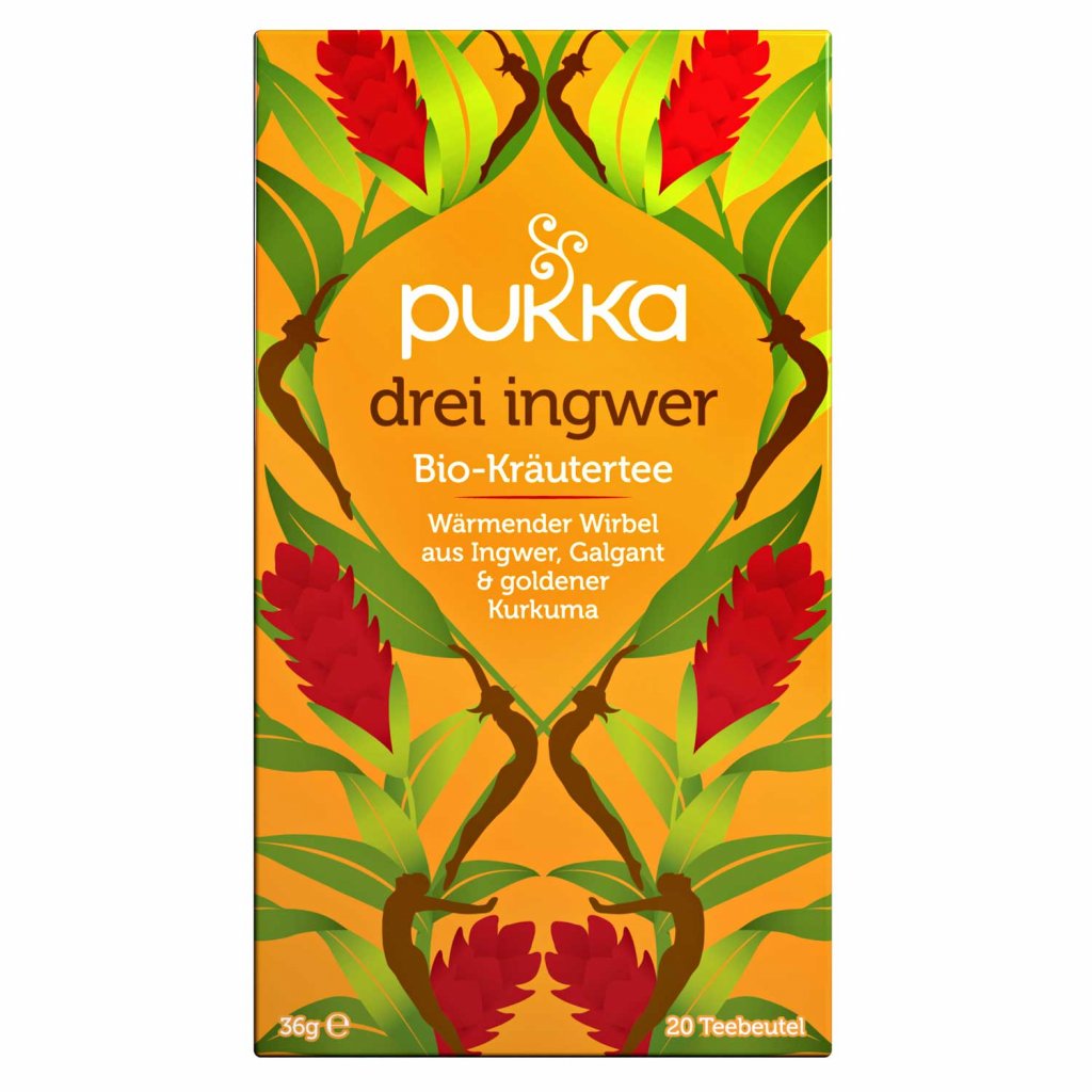 Čaj Pukka Three Ginger je všetko, čo by zázvorový čaj mal byť v skutočnosti - bohatý, korenistý a stimulujúci. Čaj Three Ginger je zmiešaný z troch lahodných koreňov z rodiny zázvorov, aby dosiahol maximálnu korenistú chuť. Čaj Three Ginger vám pomôže upokojiť trávenie, zatiaľ čo zahreje a povzbudí vašu dušu.