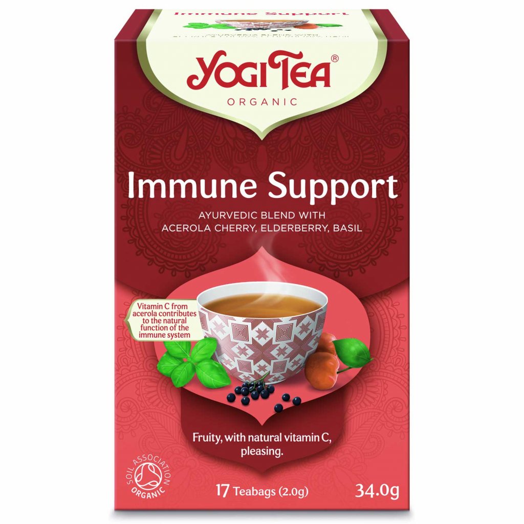 Immune support YOGI Tea® - Upokojujúci, hrejúci, posilňujúcio, s prírodným vitamínom C. Zmes s echinaceou, acerolou a bazou obsahuje bylinky, ktoré napomáhajú prirodzene podporovať imunitný systém.