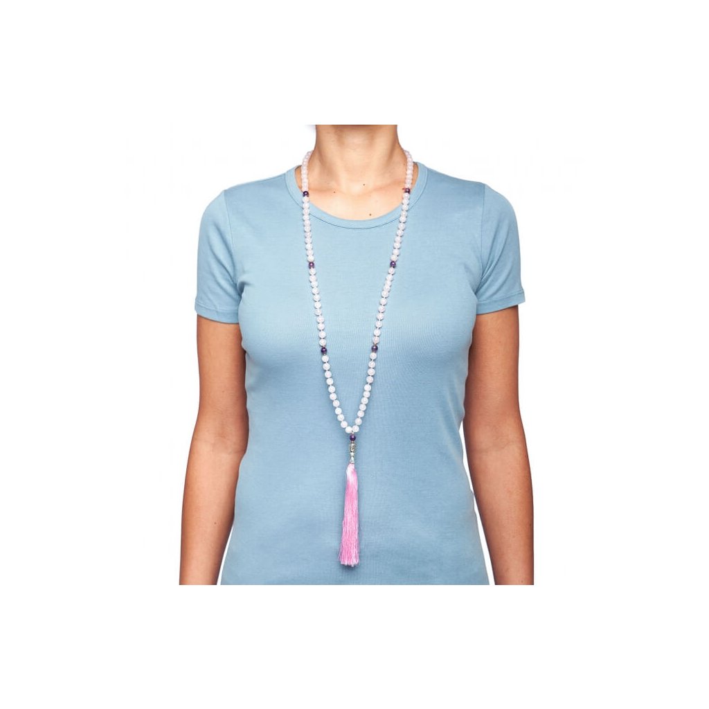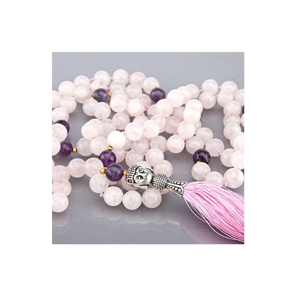 Bodhi Mala náhrdelník ruženín/ametyst s ružovým strapcom je tradičným mala náhrdelníkom s 108 kusmi korálok, tvorený z ružového kryštálu a ametystu. Ametyst je ochranný kameň a jeden z najcenejších kameňov - polodrahokamov. Dokáže pozitívne ovplyvniť fyzické aj psychické funkcie človeka.