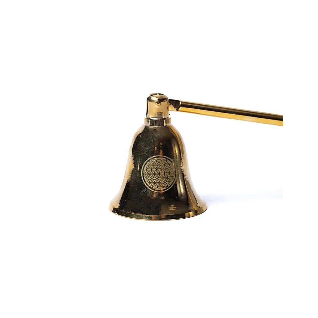 Elegantné zlaté zhášadlo na sviečky so symbolom Kvetu života, ktoré bezpečne uhasí plameň bez dymu a dodá vášmu rituálu pokojný, vedomý záver.