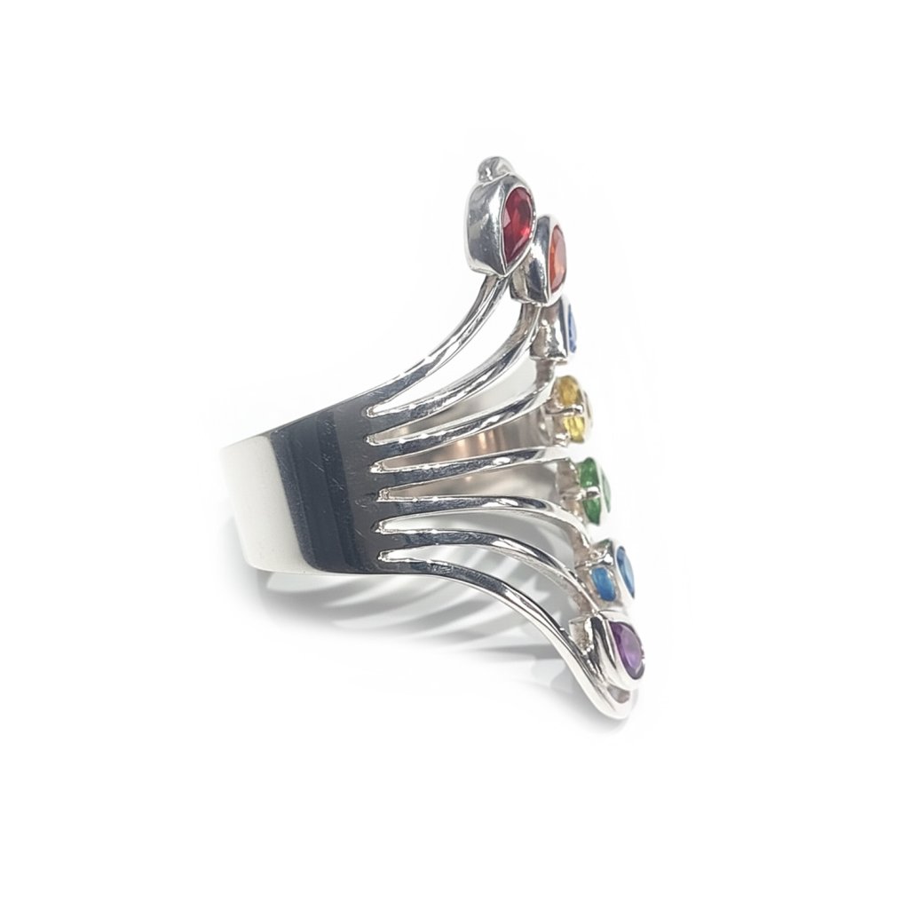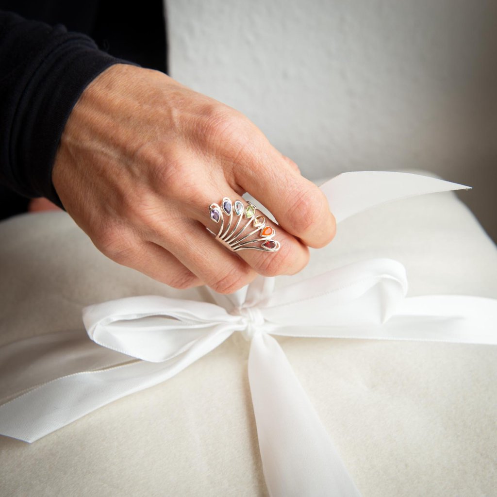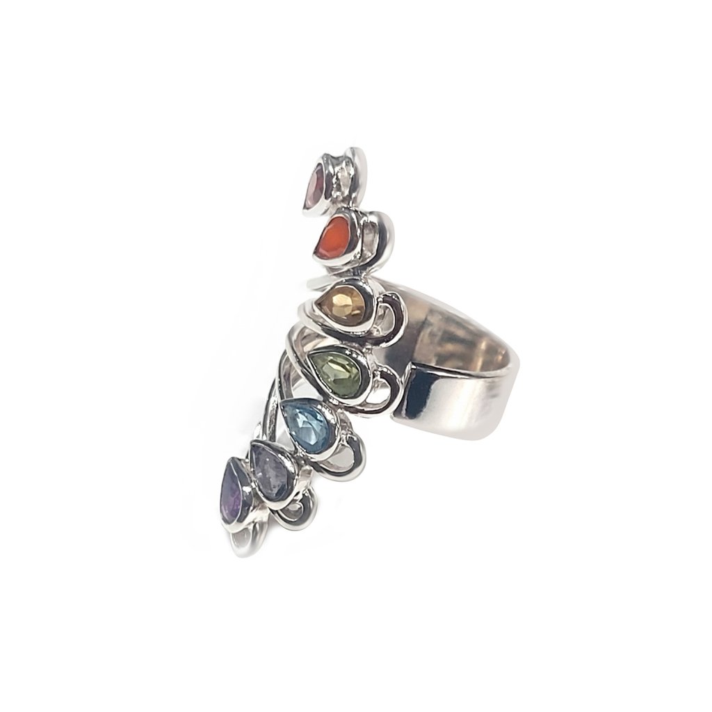 Tento chakra prsteň je jemne spracovaný, no zároveň pôsobí ako výrazný a originálny šperk. Obsahuje sedem pravých kameňov – každý reprezentuje jednu z hlavných čakier. Kamene sú zasadené do 925 sterling silver, čo dodáva prsteňu nadčasový charakter.